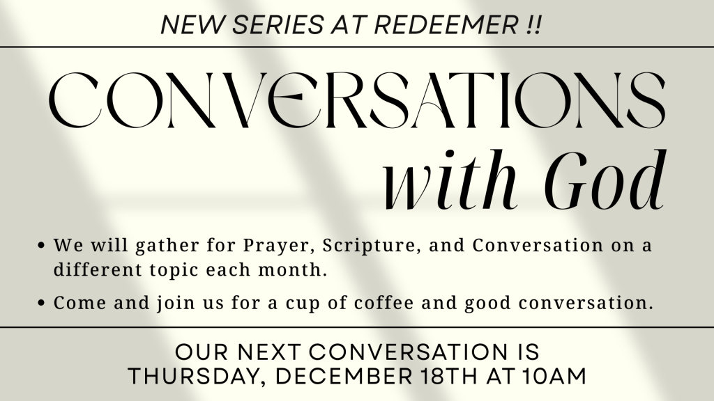 - Conversations with God: Our next Conversations with God will be held on Thursday, December 18th, at 10:00am. We will take this time to gather for prayer, Scripture, and conversation on a different topic each month. Our December gathering will be on the topic of “Jesus”. Come and join us for a cup of coffee and good conversation!!